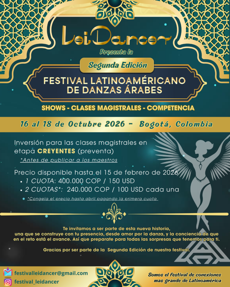 El equipo del Festival Latinoamericano de Danzas Árabes liderado por la bailarina y maestra LeiDancer, han creado este espacio para el disfrute, el fortalecimiento y la difusión de la danza oriental en Latinoamerica.